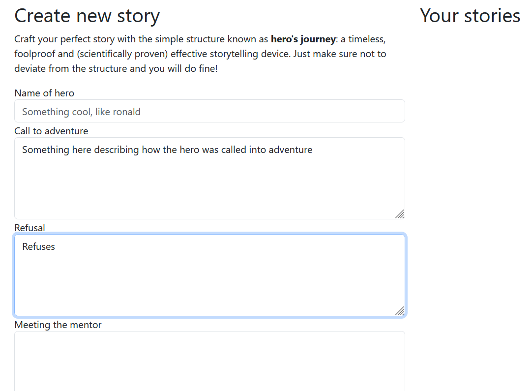 Hero’s Journey consists of a website in which you can create a story by writing in text to different sections as depicted in the following image: