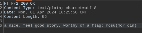 rw.Write([]byte("because of unintended solutions stemming from multiple paralell storylines, we cannot provide you with a second story, it would just be unfair to the challenge author who wants to see you suffer"))